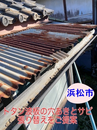 浜松市|トタン波板の庇屋根を現地調査、穴あきと重度の錆を確認し張り替えをご提案しました